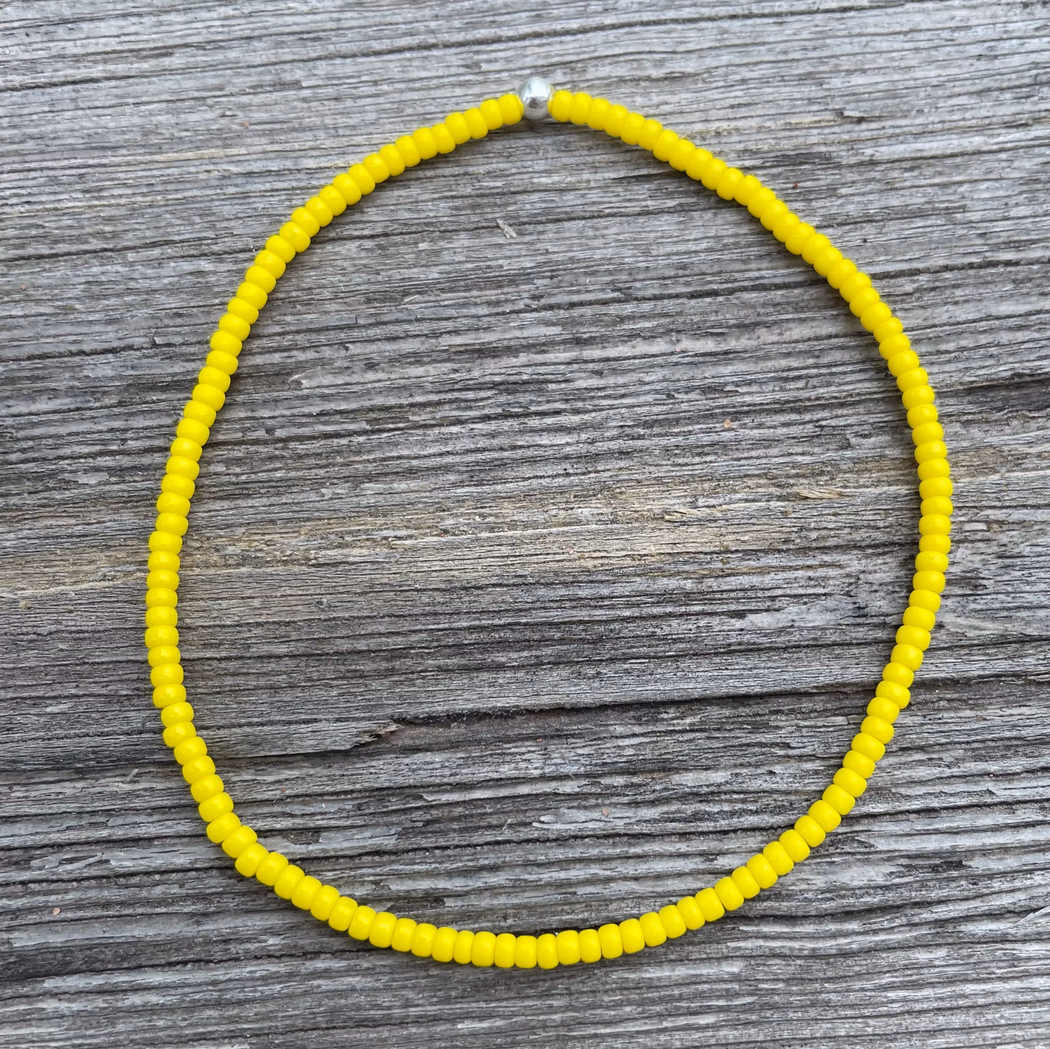 Ett enkelt armband utan krusiduller som är gjort av färgade småpärlor.
