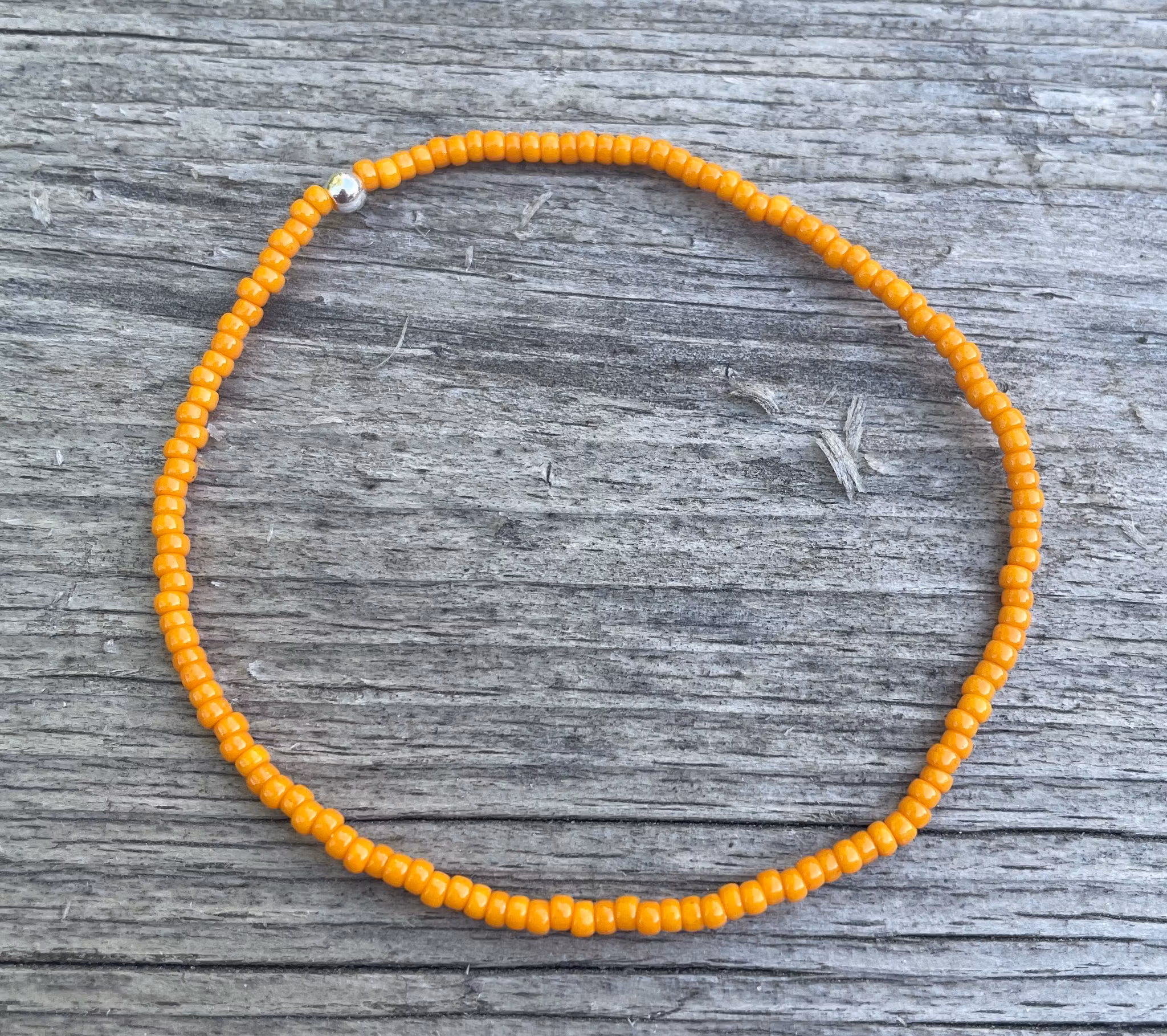 Ett enkelt armband utan krusiduller som är gjort av färgade småpärlor.