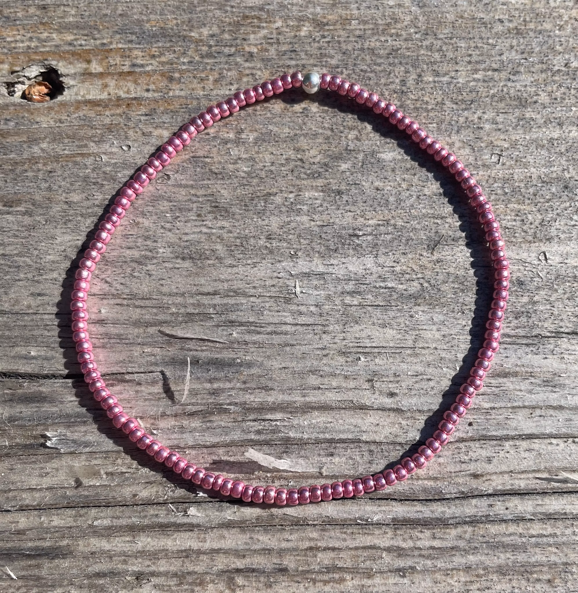 Ett enkelt armband utan krusiduller som är gjort av färgade småpärlor.