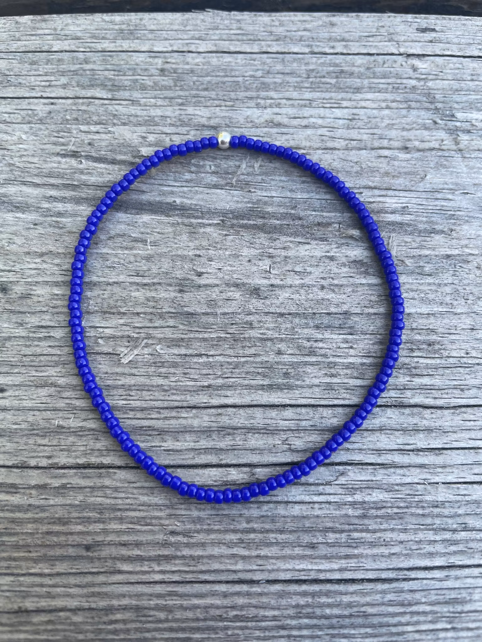 Ett enkelt armband utan krusiduller som är gjort av färgade småpärlor.