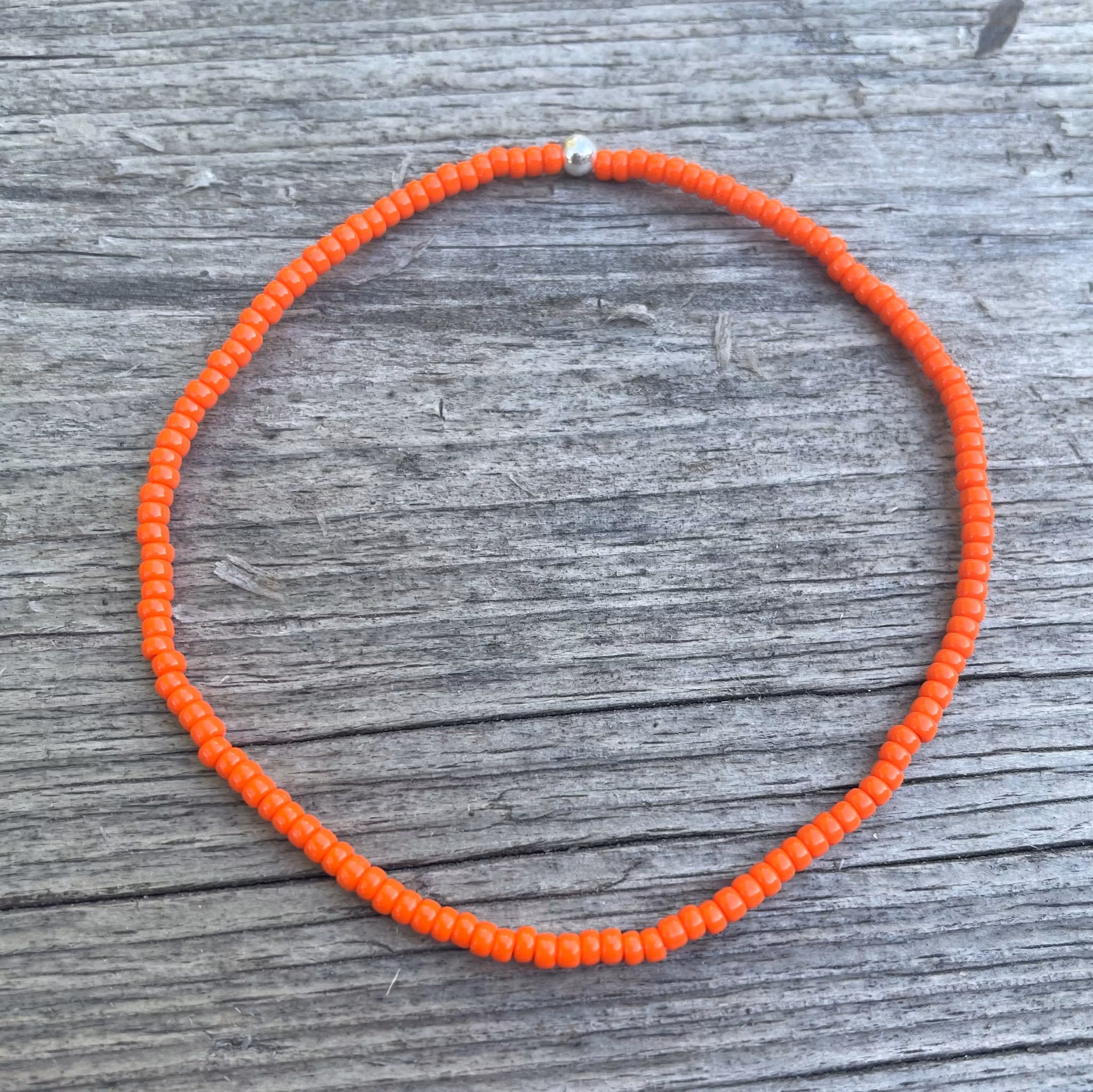 Ett enkelt armband utan krusiduller som är gjort av färgade småpärlor.