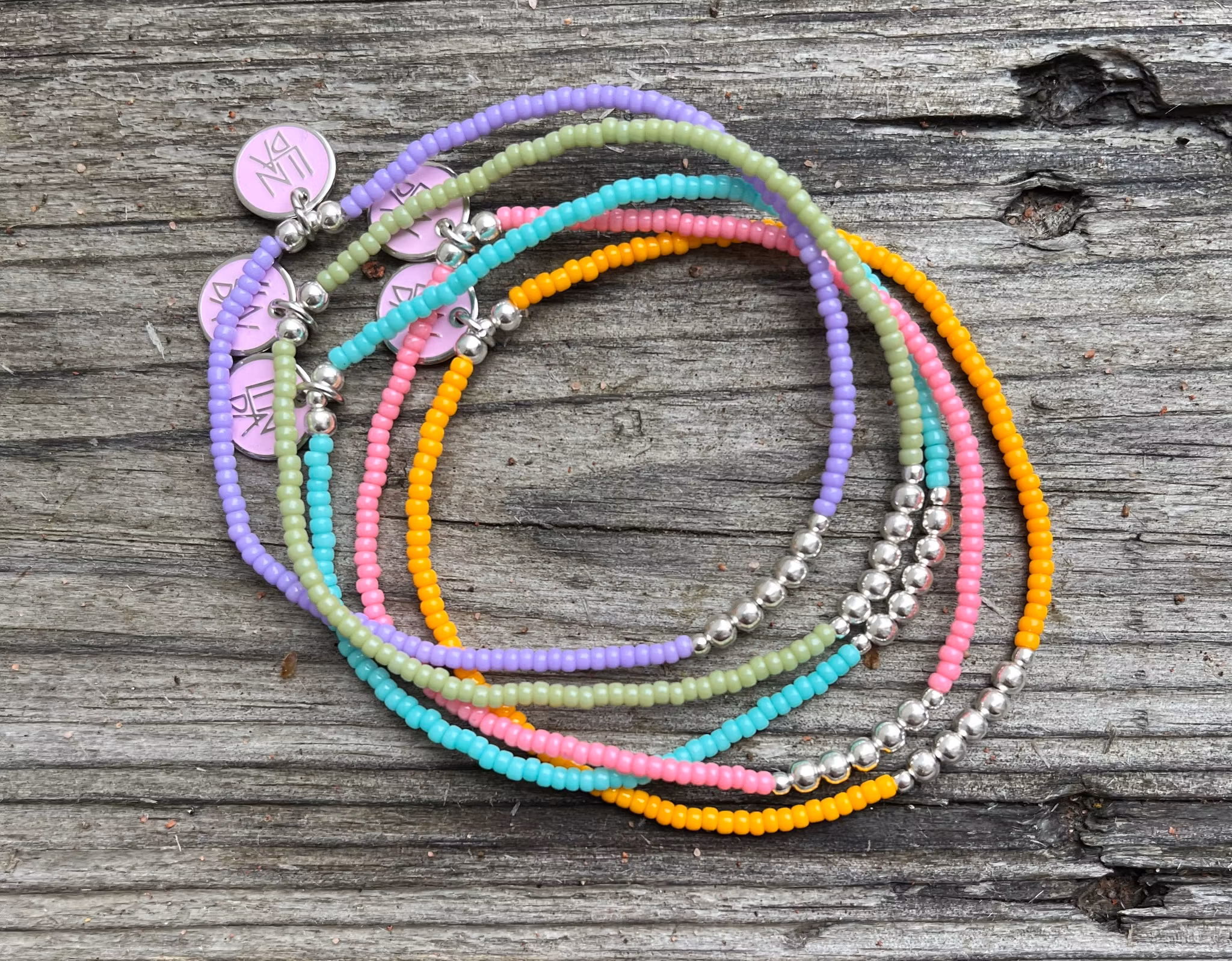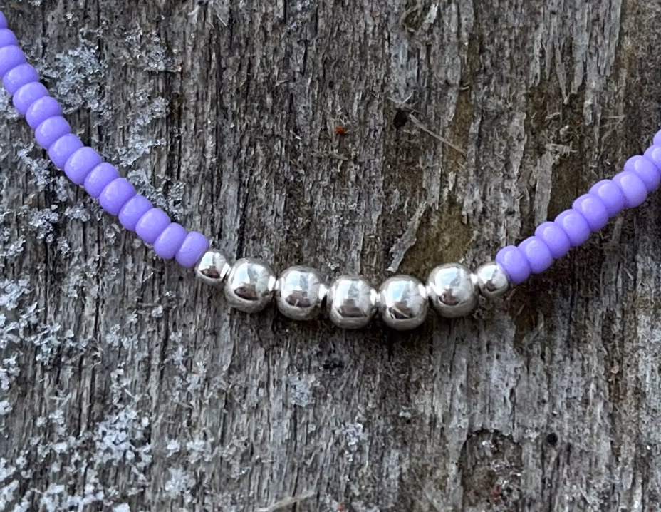 Lila småpärlor i glas och detaljpärlor i sterlingsilver.