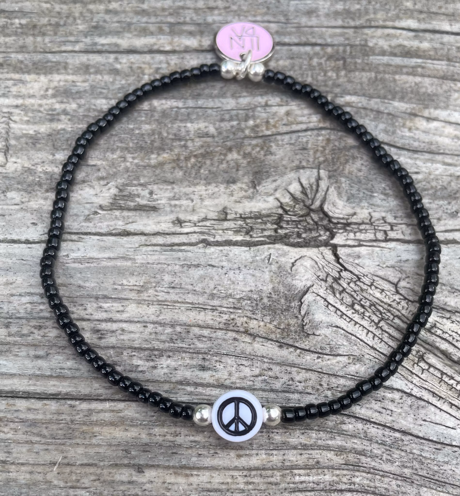 Ett enkelt snyggt armband med svarta glaspärlor och peacepärla i plast. Detaljpärlor i sterlingsilver.
