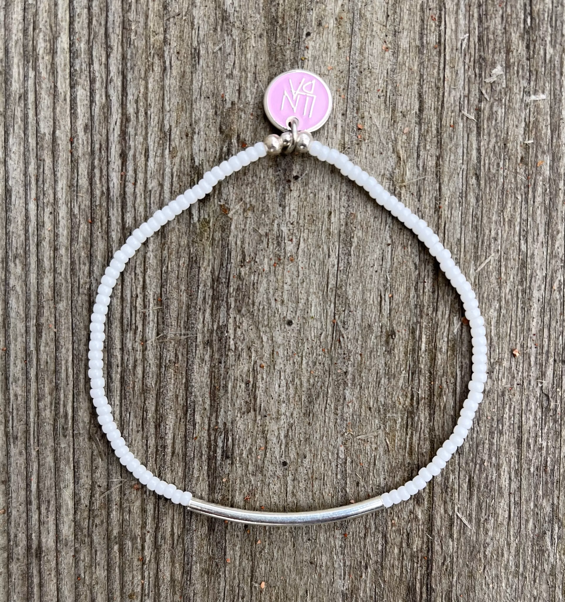Vita småpärlor och ett böjt rör i sterlingsilver. Ett stilrent armband som lätt går att kombinera med andra armband. Armbandet är i storlek medium (18 cm) och passar en handled som är ca 16-17 cm. Önskar du det i en annan storlek så meddelar du det när du checkar ut.