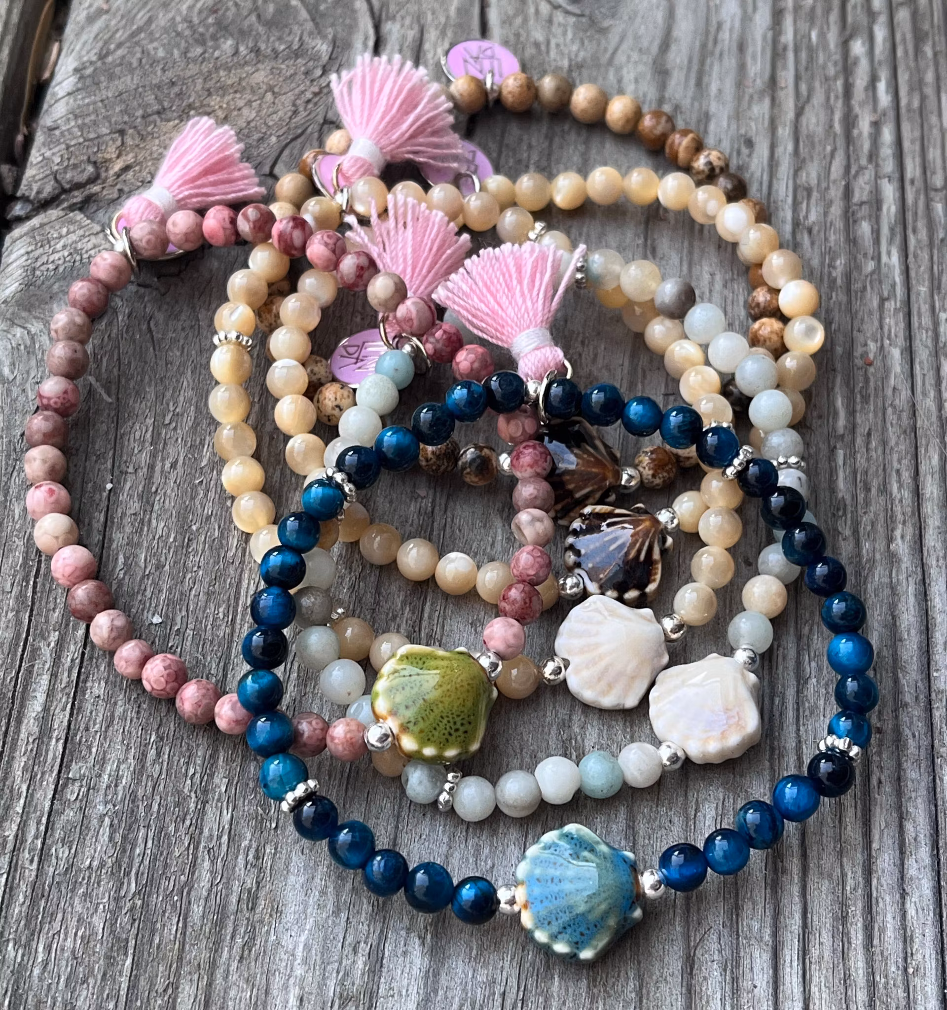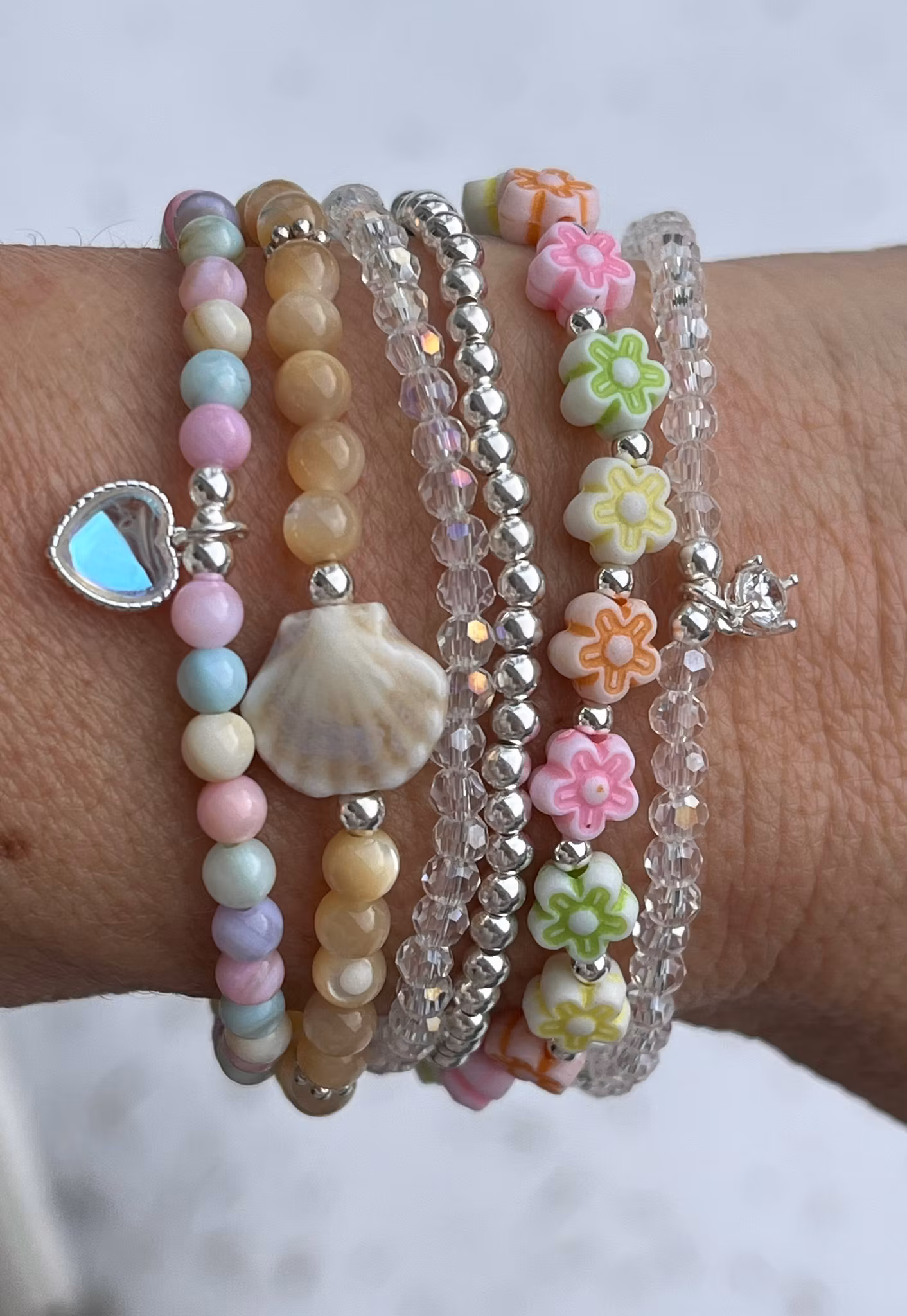 Ett somrigt, härligt armband med 4 mm stora snäckskalspärlor, snäckpärla i keramik och detaljpärlor i silver. Passar en handled som mäter 16-16,5 cm. (Storlek M)