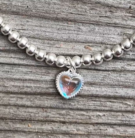 Ett vackert armband med 3 mm stora pärlor i sterlingsilver. Silverhjärta med kristallglas som gnistrar fint. Armbandet är i storlek medium (18 cm) och passar en handled som mäter ca 16-16,5 cm). Önskar du armbandet i en annan storlek så meddelar du det när du checkar ut.