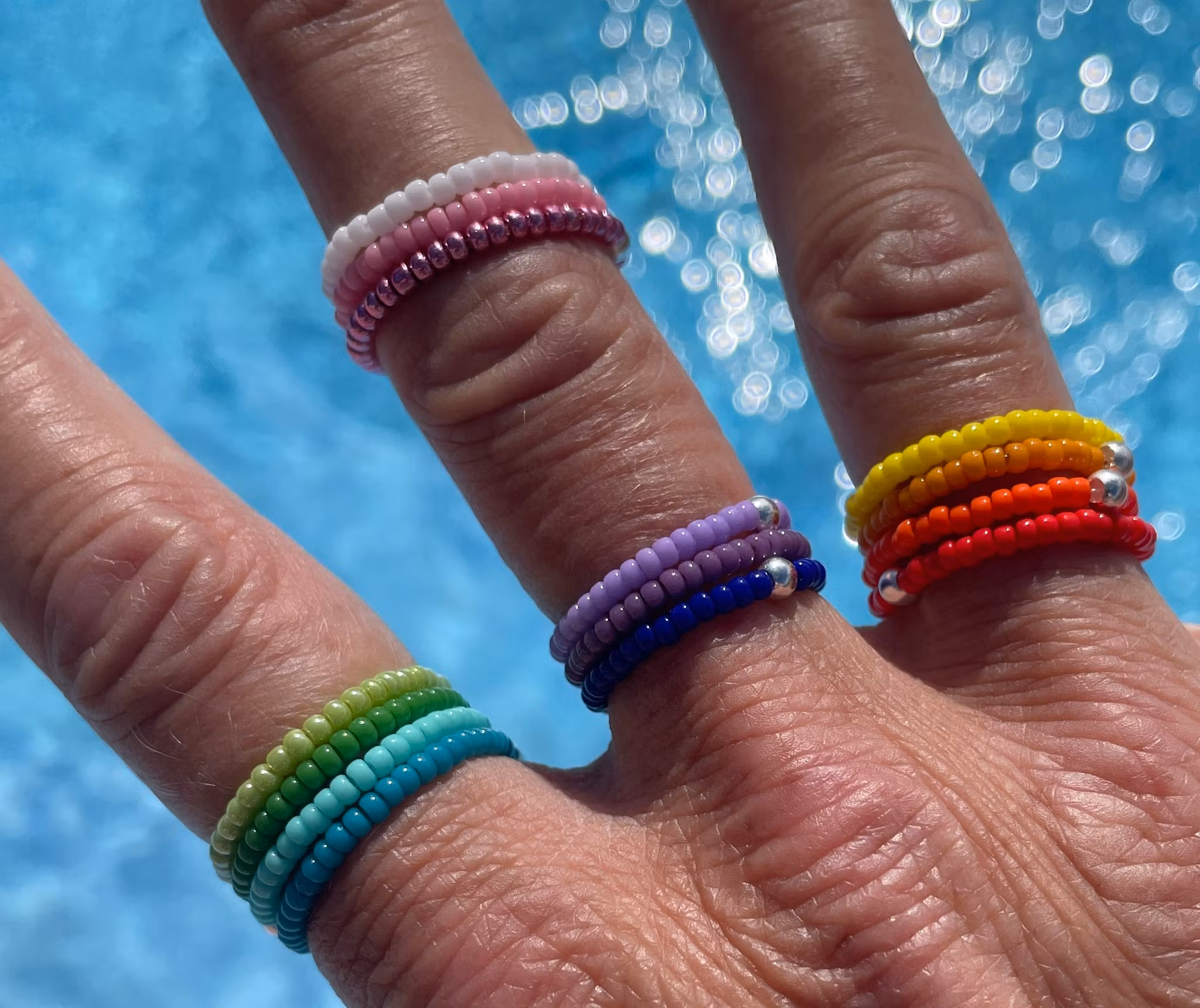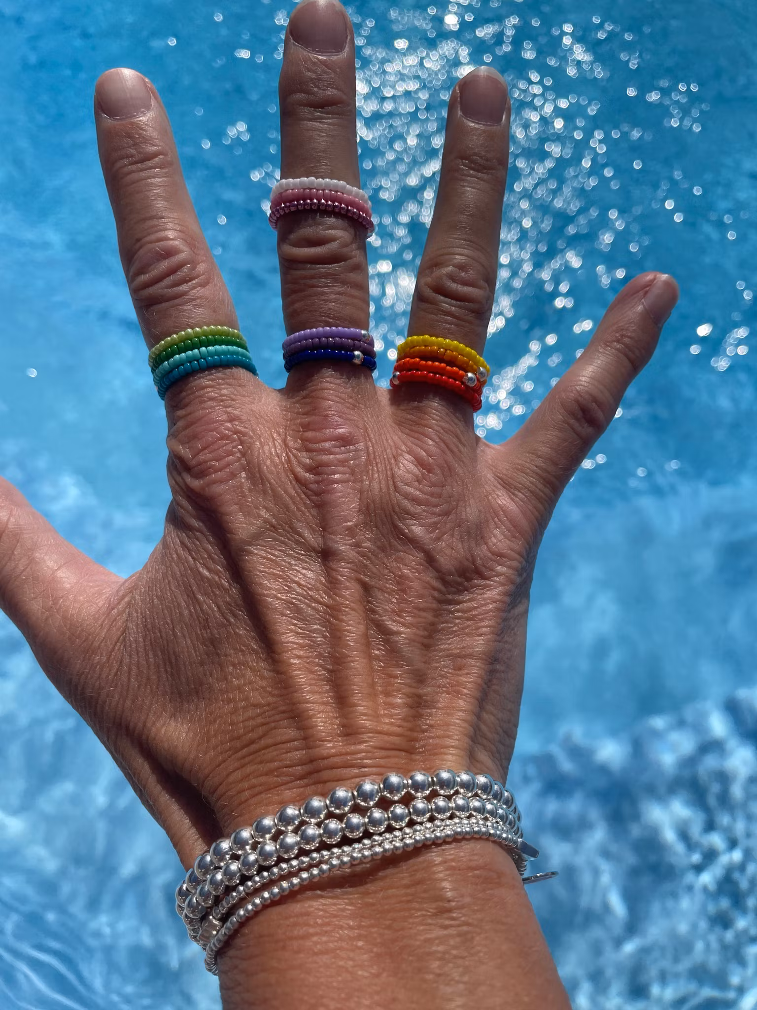 Fina, tunna och färgglada ringar som är gjorda av småpärlor i glas. Jag brukar göra dessa ringar på stark elastisk tråd och gömma knuten i en silverpärla. Om du inte säger något annat mått så gör jag dem 6 cm långa.