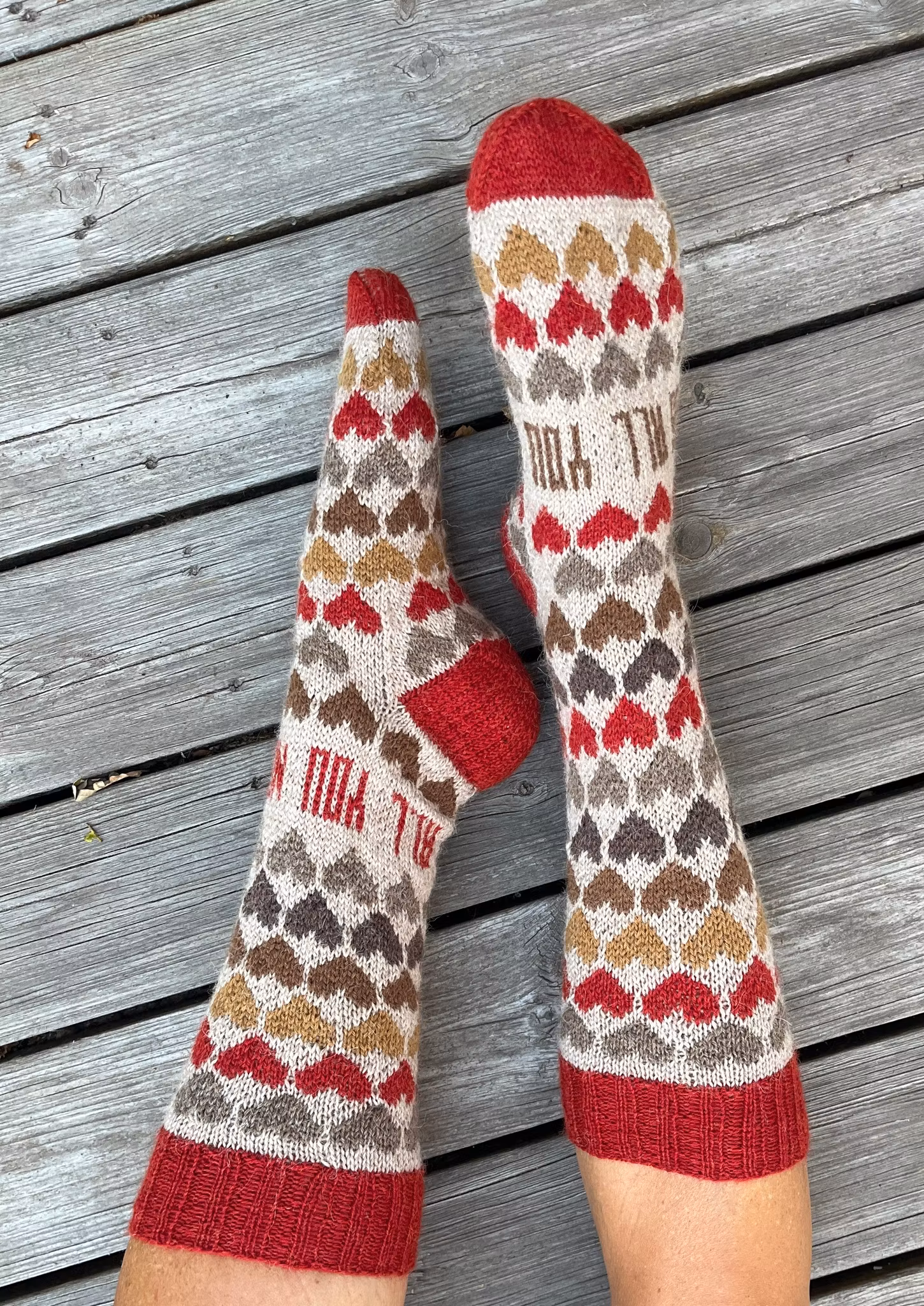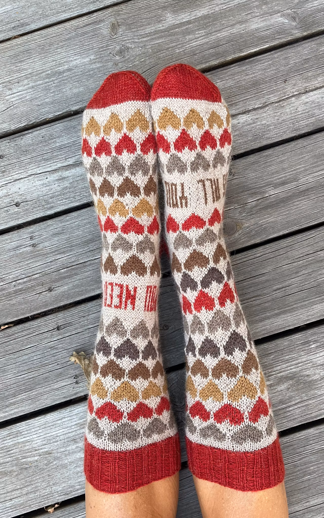 Ett par varma, unika, handstickade strumpor som passar ett par fötter i storlek 38-40. På den ena strumpan står det: ”All you need is love” och på den andra: ”Love is all you need”.