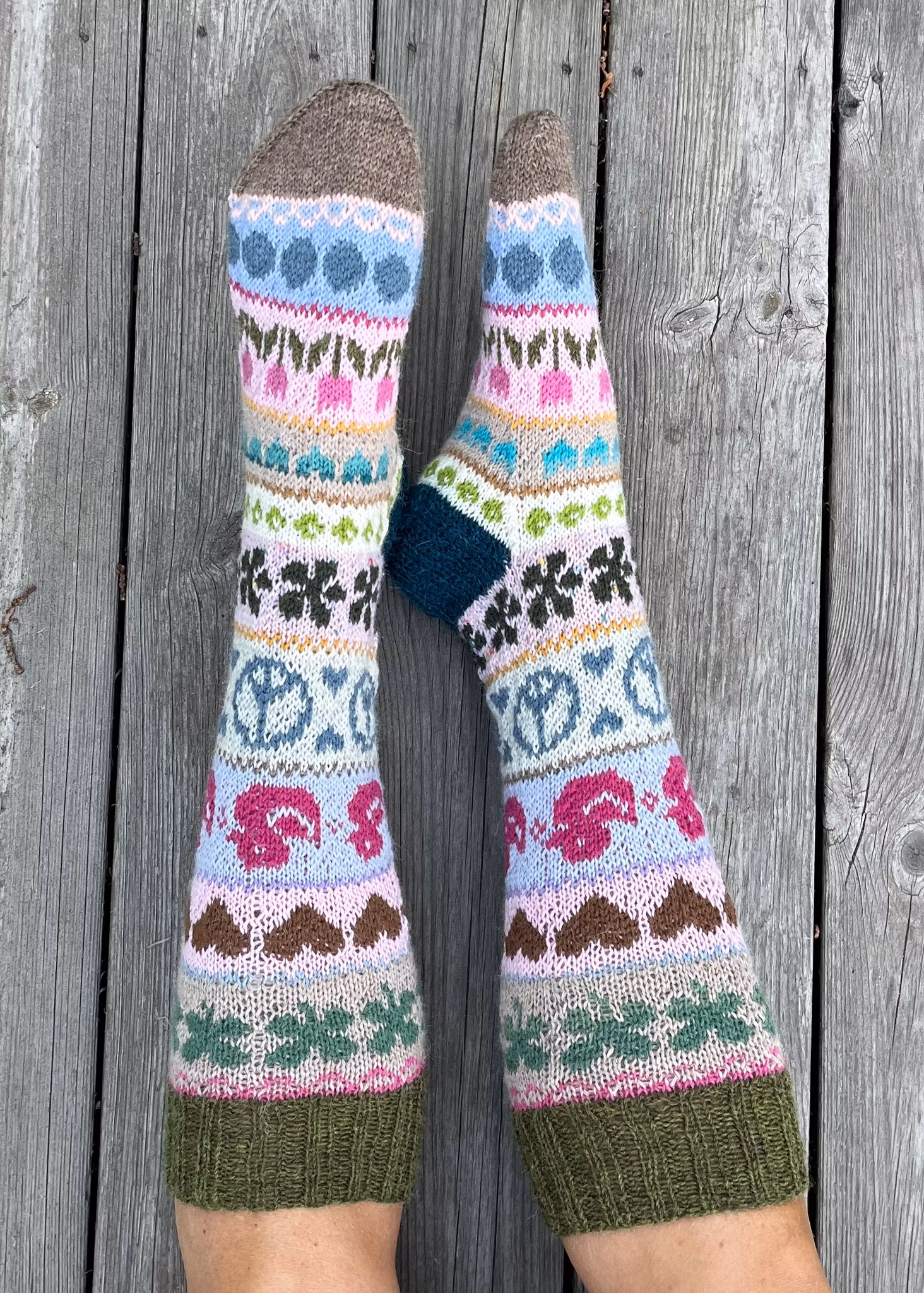 Ett par raggsockar som inte liknar något annat par:-) Sådana uppstår när stickaren inte kan bestämma vad det ska bli för mönster och har en massa smånystan med restgarn. De passar ett par fötter i storlek 38-40.