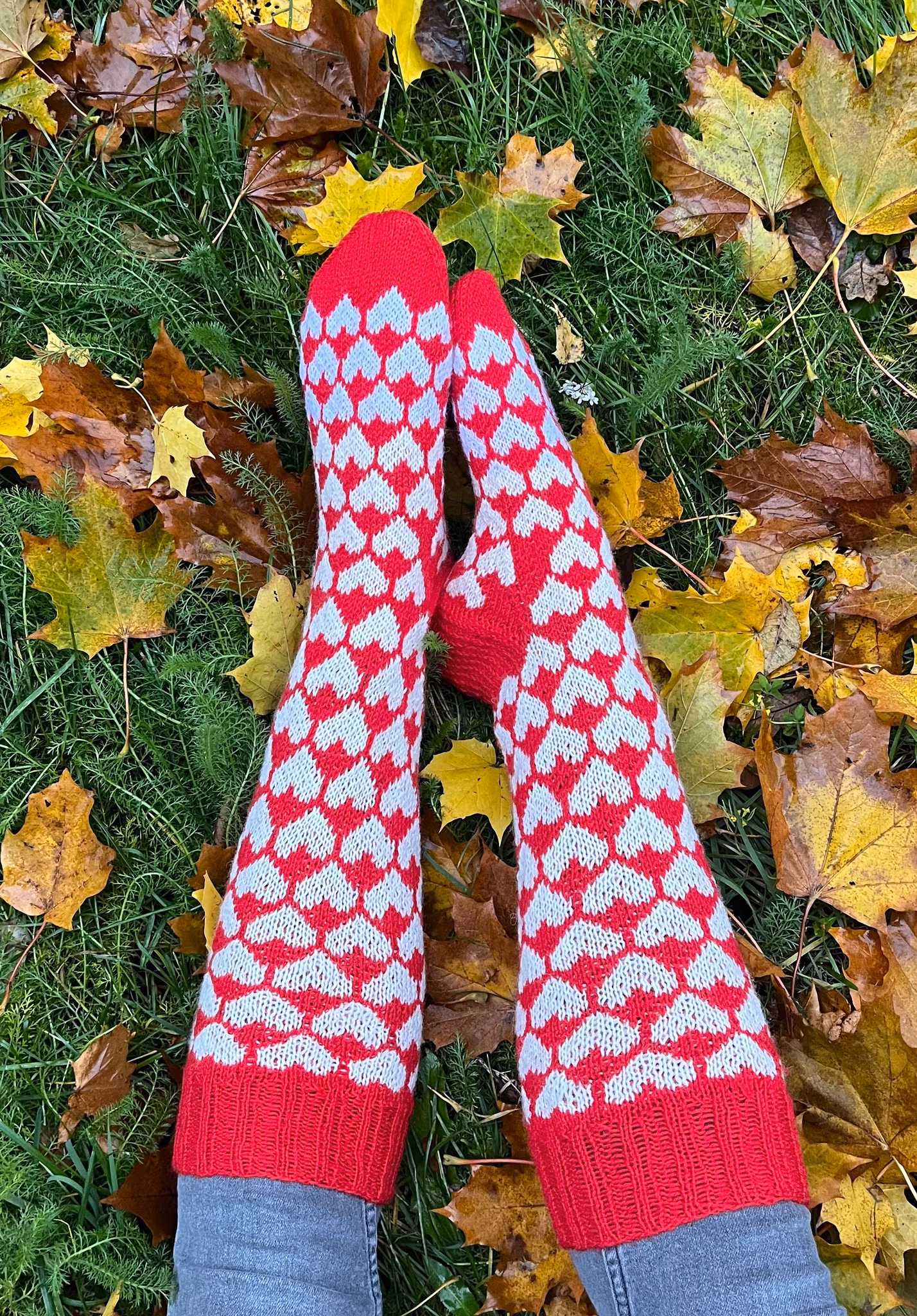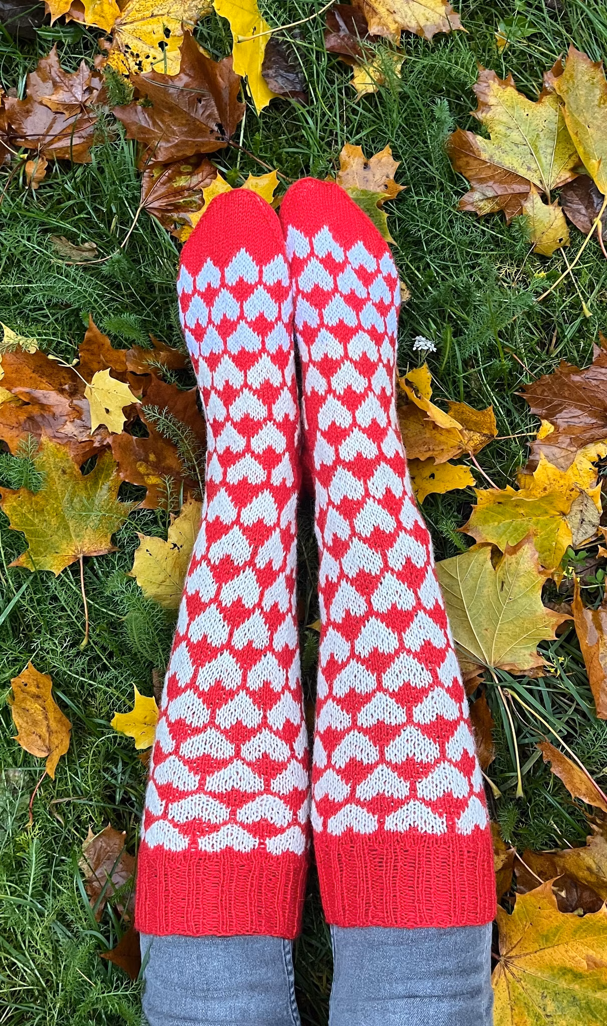 ärleksstrumpor med skönhetsfel:-) Den vita färgen tog slut så på mitten av foten så bytte jag till ett annat vitt garn. Jag vet inte om jag måste byta lampa där jag sitter och stickar för de två vita nystanen såg exakt likadana ut i färgen. Men när jag skulle fota dem så såg jag att hjärtanen nere på foten, vid tårna, är vitare än resten av hjärtanen… Strumporna är hela och korrekt stickade i övrigt och passar en fot i storlek 38-40.