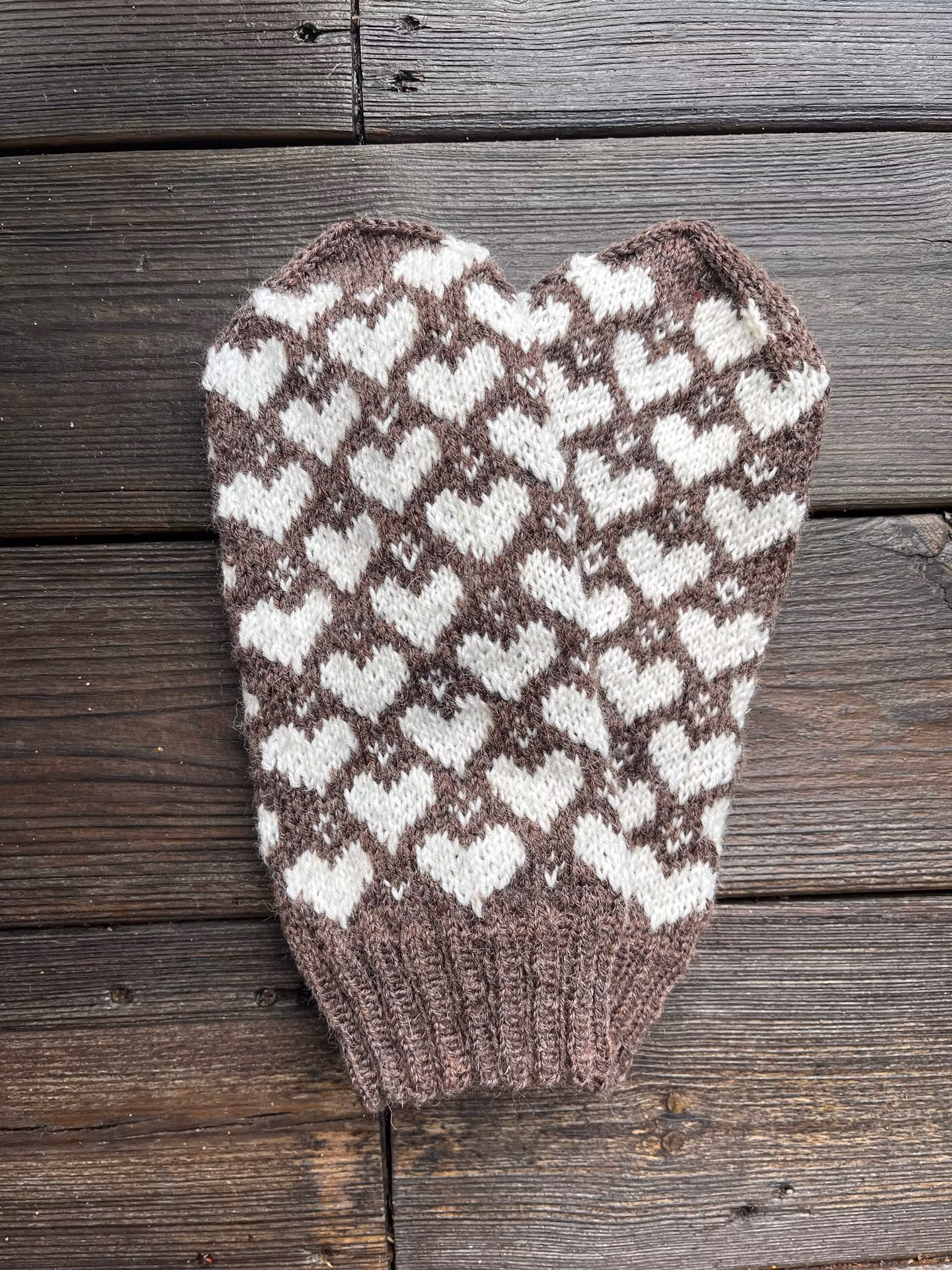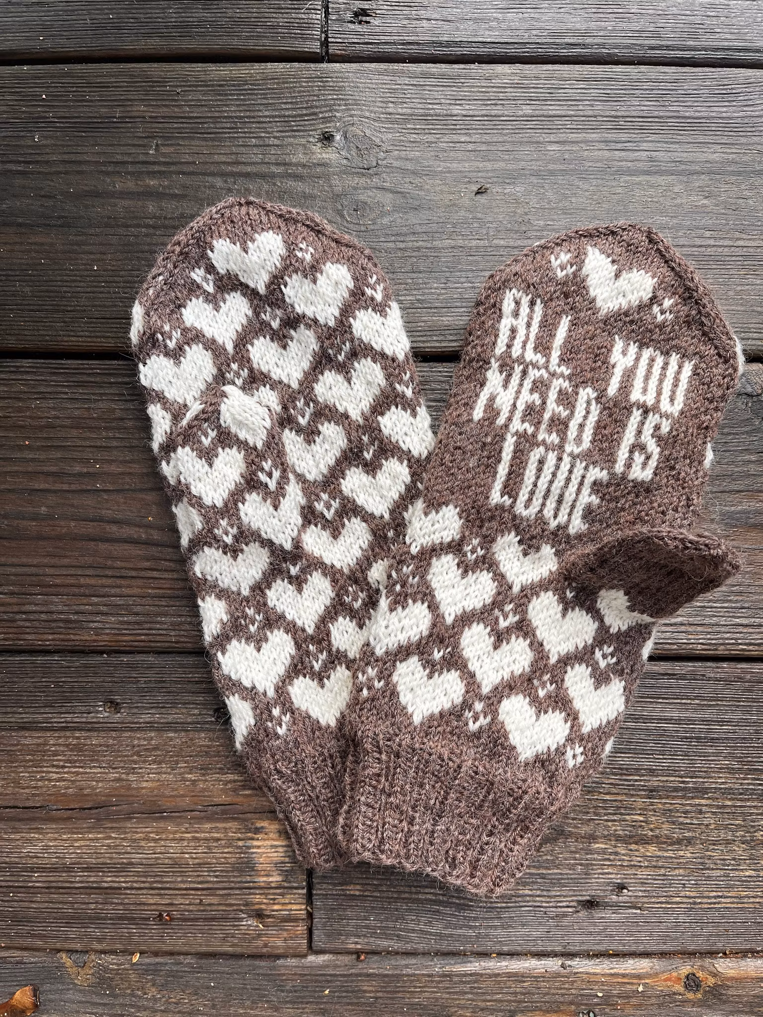 Bruna vantar med vita hjÀrtan. PÄ höger handflata finns ett kÀrleksfullt meddelande. Vantarna Àr stickade i mjuk, varm ull och passar en vuxen kvinnas hÀnder om hon inte har extra smÄ hÀnder - i sÄ fall kommer dessa att vara för stora.